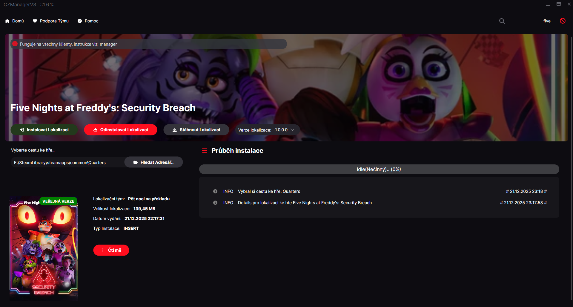guys našel jsem Bypass aby jste nemuseli instalovat CZ manager stačí jenom tento file který si stáhnete tady od nich jmeno:fnaf9-windowsnoeditor_cestina.pak stačí tento file dát tohodle: D:\Steam\steamapps\common\Quarters\fnaf9\Content\Paks vložte a spusťte hru a vše by mělo fungovat a přidejte ty movie / cutsceny do tohodlě: D:\Steam\steamapps\common\Quarters\fnaf9\Content\Movies a musíte si uložit burntrap ending, Fazerblast ending,GregoryinAlley ending, loadingDock ending, Vanny redeemed, VIP ending. A tyto si dejte např: na plochu a ty co si stáhnete od nich tak vložíte do toho kde jste to odebraly děkuji snad to bude fungovat i vám. :) -
